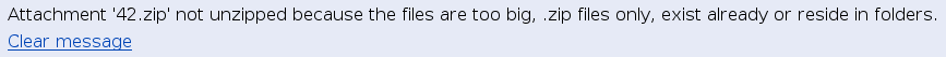 Ми реалізувати певний захист сервера від некоректного використання цієї функції. Zip-файл запакований у Zip-файлі відкидається без розпаковування. При визначенні параметру конфігурації unzip_attachments_space, можна встановити обмеження у байтах на розпаковування файлів. Якщо у каталозі вже є файли, їх розмір віднімається від цього числа. Розмір одного файлу у архіві, який буде розпаковуватися можна обмежити параметром конфігурації unzip_single_file_size. У unzip_attachments_count можна обмежити кількість файлів, які розпаковуються з zip-файлу.